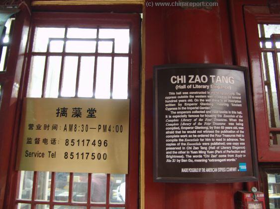 The words "Chi Zao" in the name of the hall refer to the classical story "Reply to Bin Xi" by Ban Gu and carry the meaning of "Extravagant".