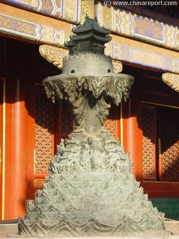 Immediatly behind the Devaraja Hall is a bronze tripod upon which an object known as a Ding (Ding: dark lustrous patina). Around the top of it are 6 dragons, each of which is frolicking about and playing with a pearl. Depicted down at the Base are three lions, each of which is symbolically playing with a Ball. Both are recurring themes within Imperial Status Buildings & Temples.