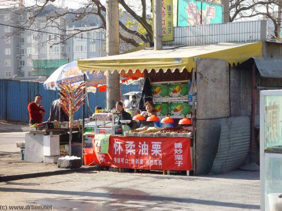 Traditional street snacks and other foodstuffs on sale at small stalls on street-corners of the Tianqiao area of Xuanwu District in the old City area's of Beijing (photos November 2002).