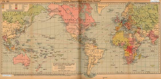 Colonialism - 1912 World Map of Colonial Possessions & Trade Routes.